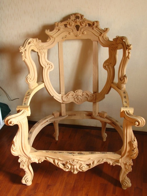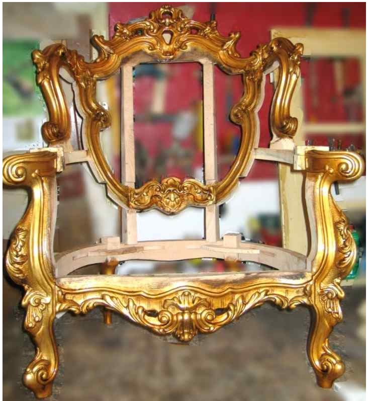 TRENUTNO U PONUDI! FOTELJA S MEDALJONOM mogućnost pozlate ili politure (orah, mahagoni, palisander...). Sirova drvene konstrukcije (rama) fotelje prije višeslojne obrade brušenjem,pigmentiranjem,nijansiranjem i poliranjem do konačnog željenog izgleda (sl.1) Naša fotelja je išla u pozlatu (sl2.), a zatim u proces postarivanja kako bismo dobili nijansu royal gold (sl.3). Potom slijedi tradicionalan način tapeciranja opisan u poglavlju opis izrade, te na kraju presvlačenje nekim od naših mebl štofova, anilina (kože), ili u ovom slučaju kvalitetnim crnim pamučnim materijalom po želji stranke (sl.4 i sl.5). Na ovaj artikal trenutno odobravamo popust od 10 %. Minimalno vrijeme od narudžbe do isporuke je mjesec dana, što se ne odnosi na one u trenutnoj ponudi. Ovo je samo jedan od naših 150 artikala fotelja, sofa, dvosjeda, trosjeda i stolova iz različitih vremenskih razdoblja koje možete naručiti. Dakle možete izabrati sve po Vašem ukusu od oblika drvene rame, preko politure ili pozlate do materijala za tapeciranje! Slobodno nas kontaktirajte i mi ćemo Vam prezentirati sve što je u našoj ponudi. Zbog velikog izbora drvenih rama trenutno nismo u mogućnosti imati sve na našim stranicama, ali uskoro pripremamo manji katalog za objavu!